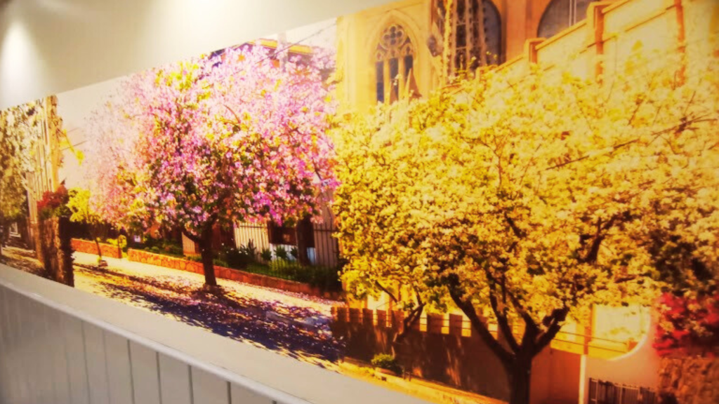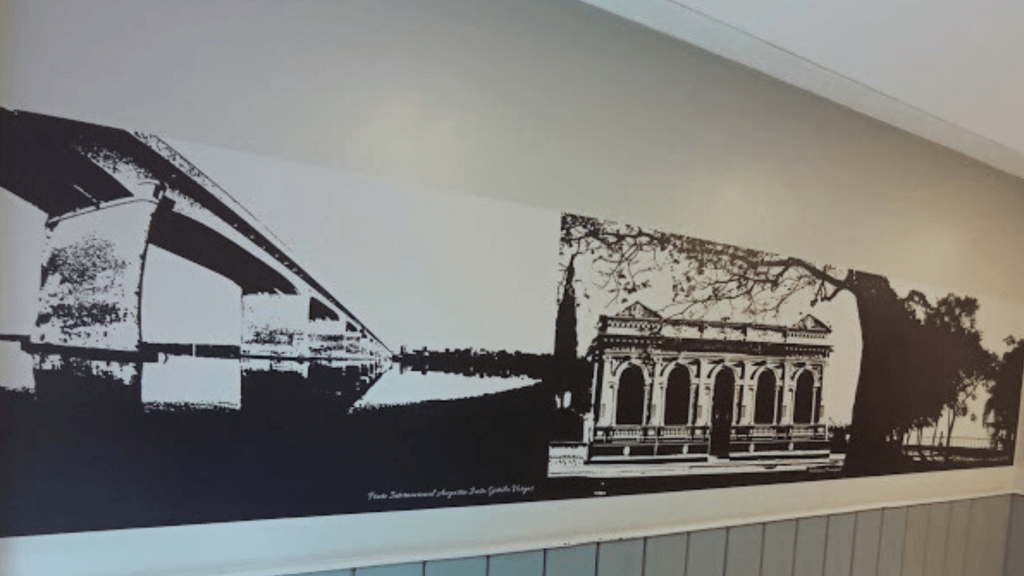 Nos corredores do hotel, painéis mostram Uruguaiana